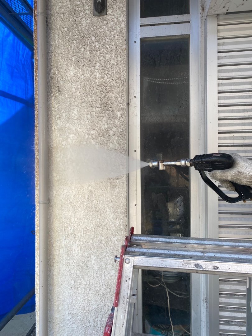 純心塗装では、外壁材の状態を確認しながら水圧を調整し、素材を傷めないよう丁寧に高圧洗浄を行っています。