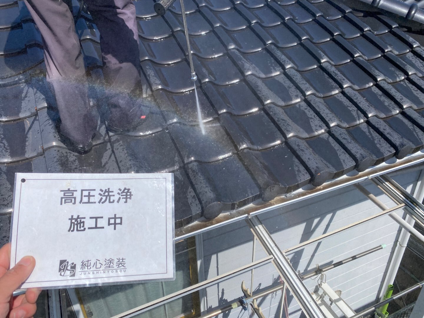 今回の屋根は瓦屋根なので塗装はしないですが、汚れやコケ等を洗い流します。
